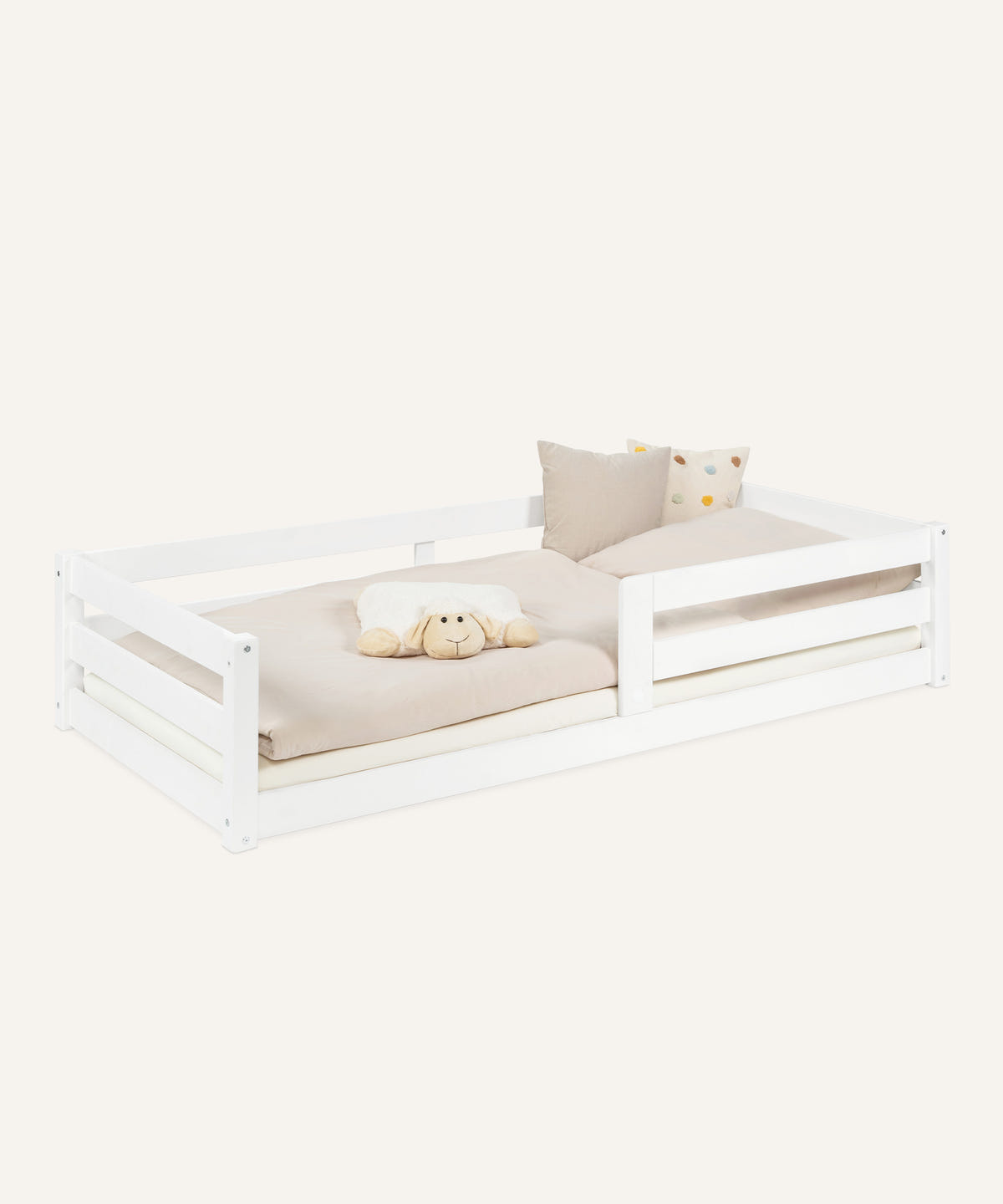 Dank des abnehmbaren Rausfallschutzes schläft dein Kind geschützt, vor allem in den ersten Jahren. Das Bett wird aus FSC-zertifiziertem Kiefernholz gefertigt, unter fairen Bedingungen in Europa hergestellt und mit einer kindersicheren, weißen Lackierung versehen.