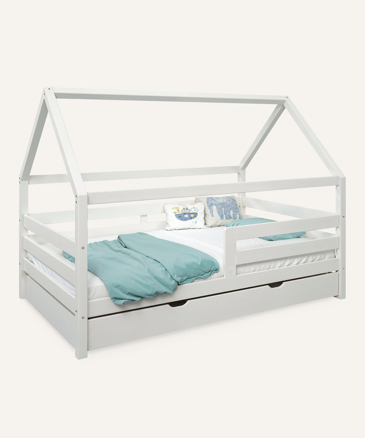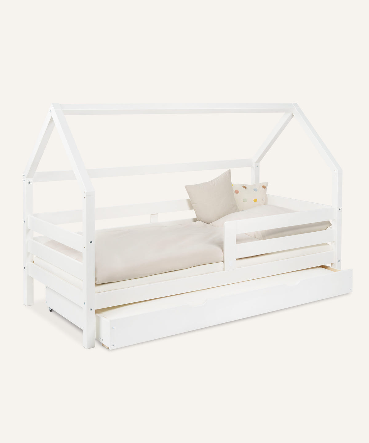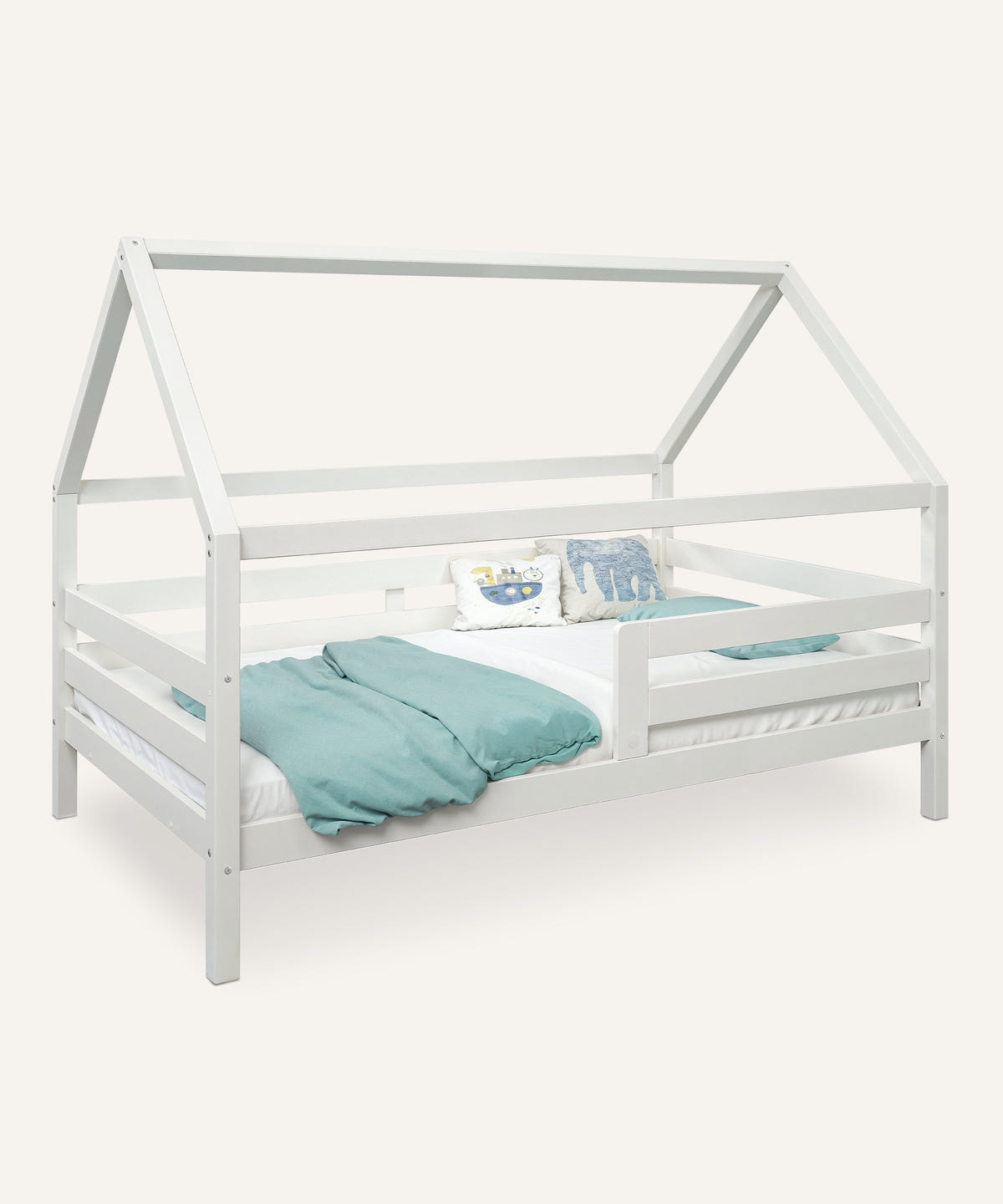 Das Hausbett Sona in weißer Ausführung bringt Helligkeit und Geborgenheit ins Kinderzimmer. Gefertigt aus nachhaltig gewonnenem Kiefernholz und versehen mit einer kindersicheren Lackierung, schafft es einen sicheren Ort zum Träumen, Spielen und Entspannen. Die relativ niedrige Liegehöhe ermöglicht es deinem Kind, selbstständig ein- und auszusteigen und fördert so die eigene Selbstständigkeit.