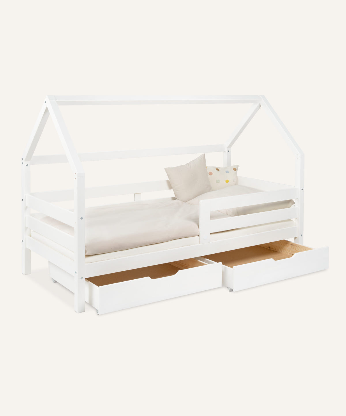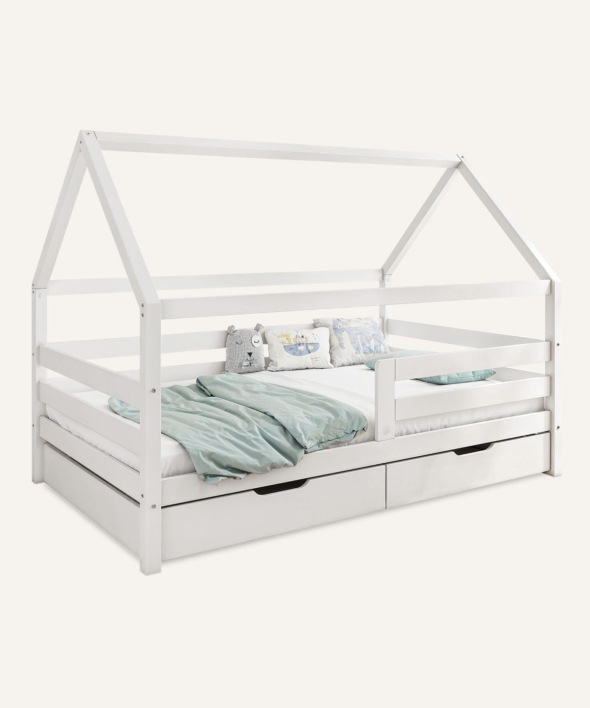 Das massive Holzdach lässt sich mit Lichterketten, Stoffen oder anderen Accessoires dekorieren – so wird das Bett zur persönlichen Wohlfühloase. Dank des abnehmbaren Rausfallschutzes bietet es zugleich Sicherheit und Flexibilität. Optional sorgen Schubladen oder ein Bettkasten für wertvollen Stauraum. Die hochwertige Verarbeitung garantiert Stabilität und eine lange Lebensdauer.