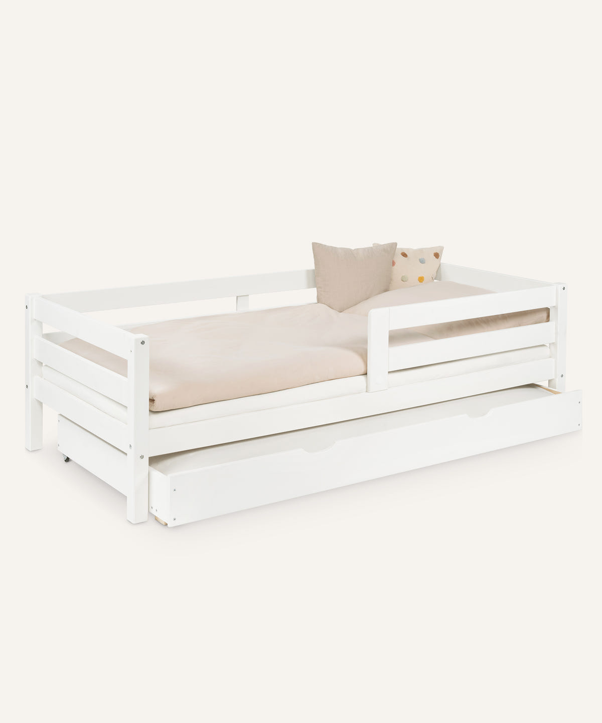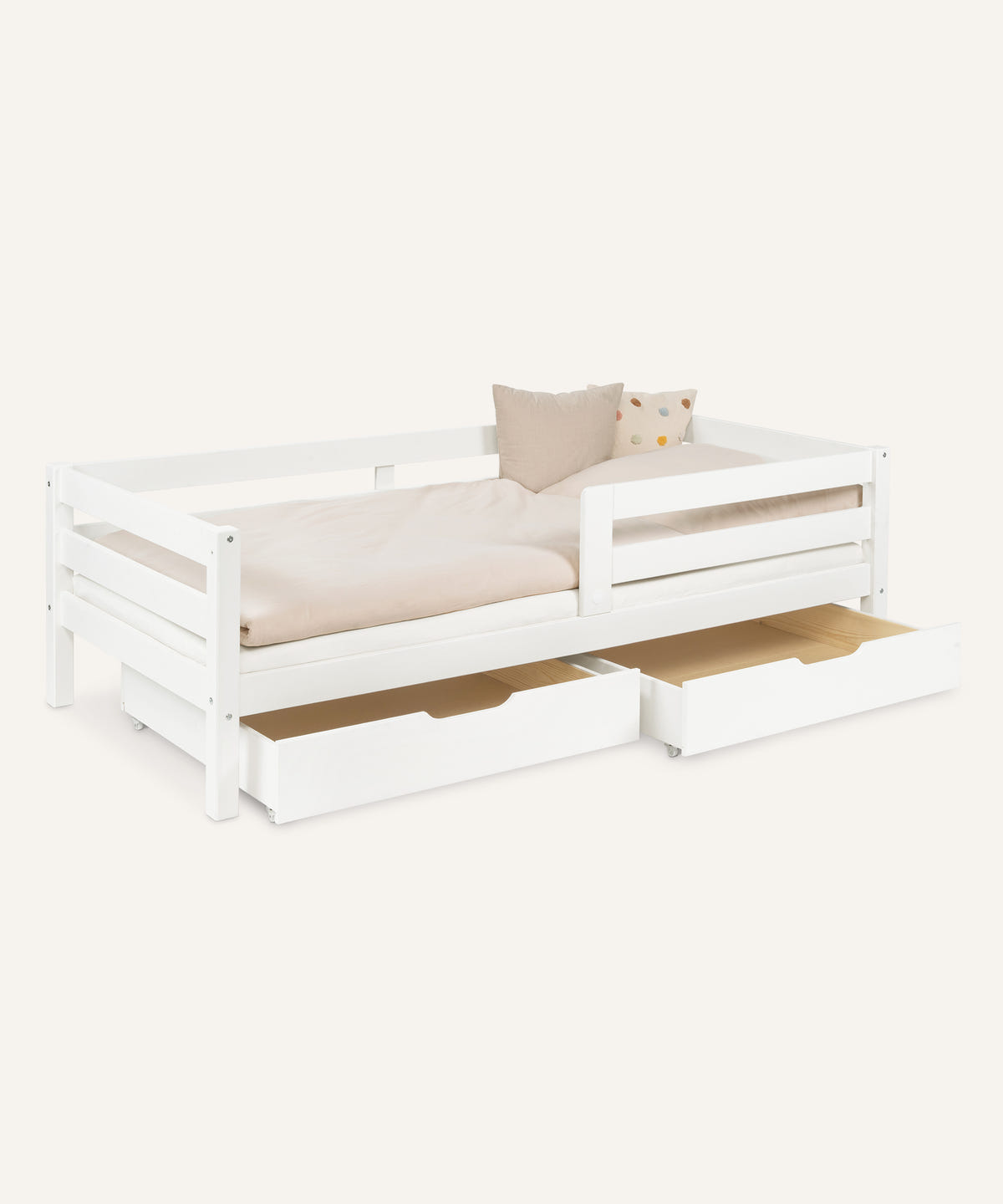 Der abnehmbare Rausfallschutz sorgt dabei für zusätzliche Sicherheit. Optional lässt sich das Bett mit einem Bettkasten oder zwei Schubladen ergänzen – ideal zum Verstauen von Spielzeug, Decken oder Kleidung. Die hochwertige Verarbeitung macht das Kinderbett Sona zu einem zuverlässigen Begleiter für viele Jahre.