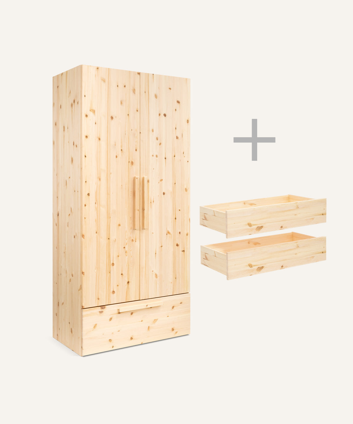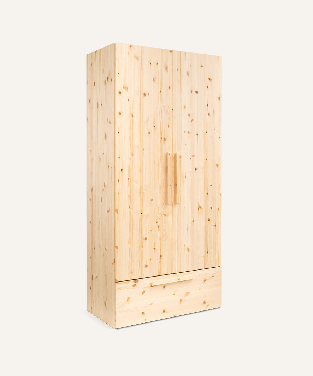 Der Schrank besteht aus FSC®-zertifizierter, naturbelassener Kiefer – ein Holz, das Wärme ausstrahlt, sanft duftet und durch seine lebendige Maserung jedes Stück einzigartig macht. Dank seines relativ geringen Gewichts bleibt der Schrank flexibel und begleitet Familien über viele Jahre hinweg – leicht, nachhaltig und beständig.
