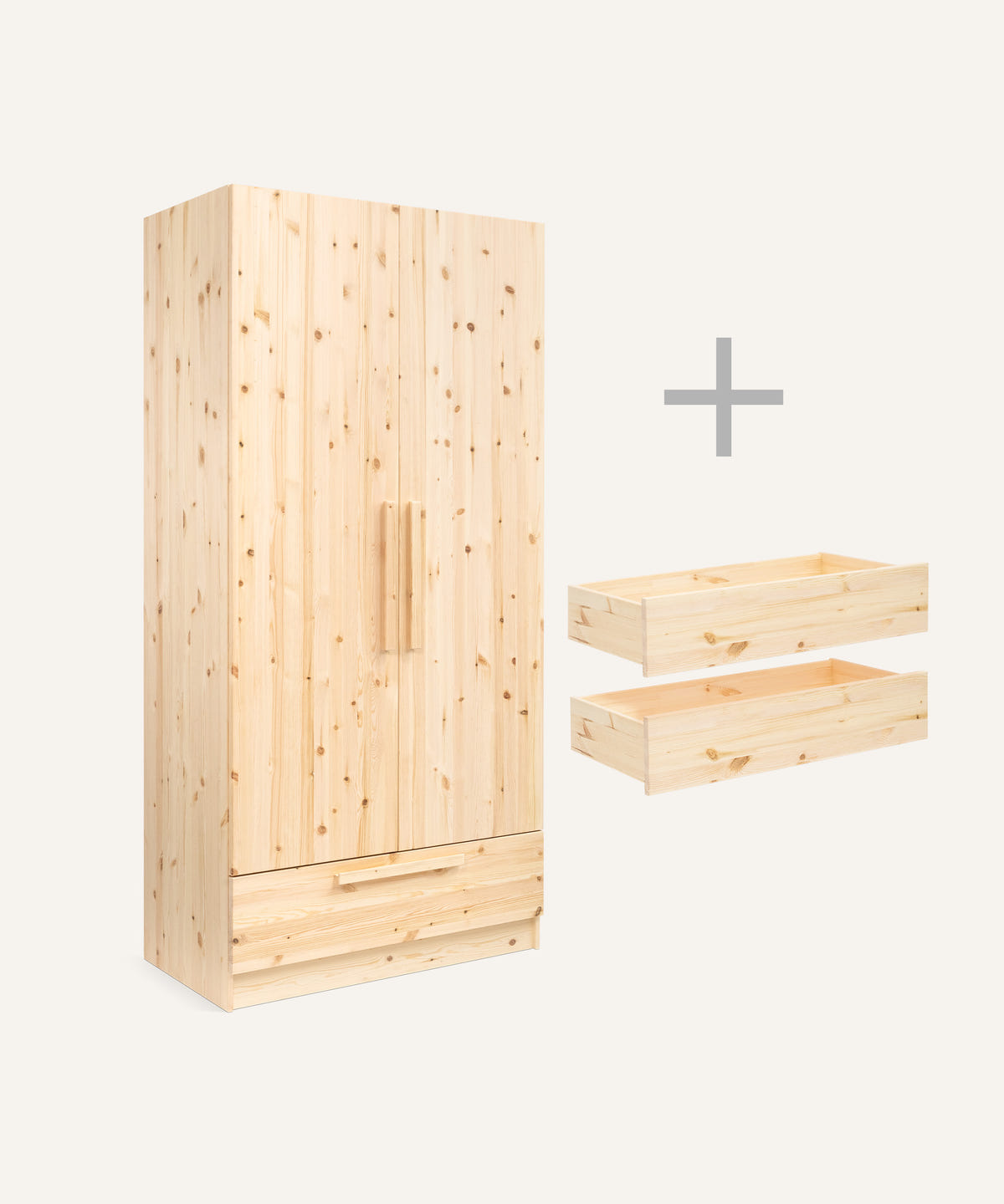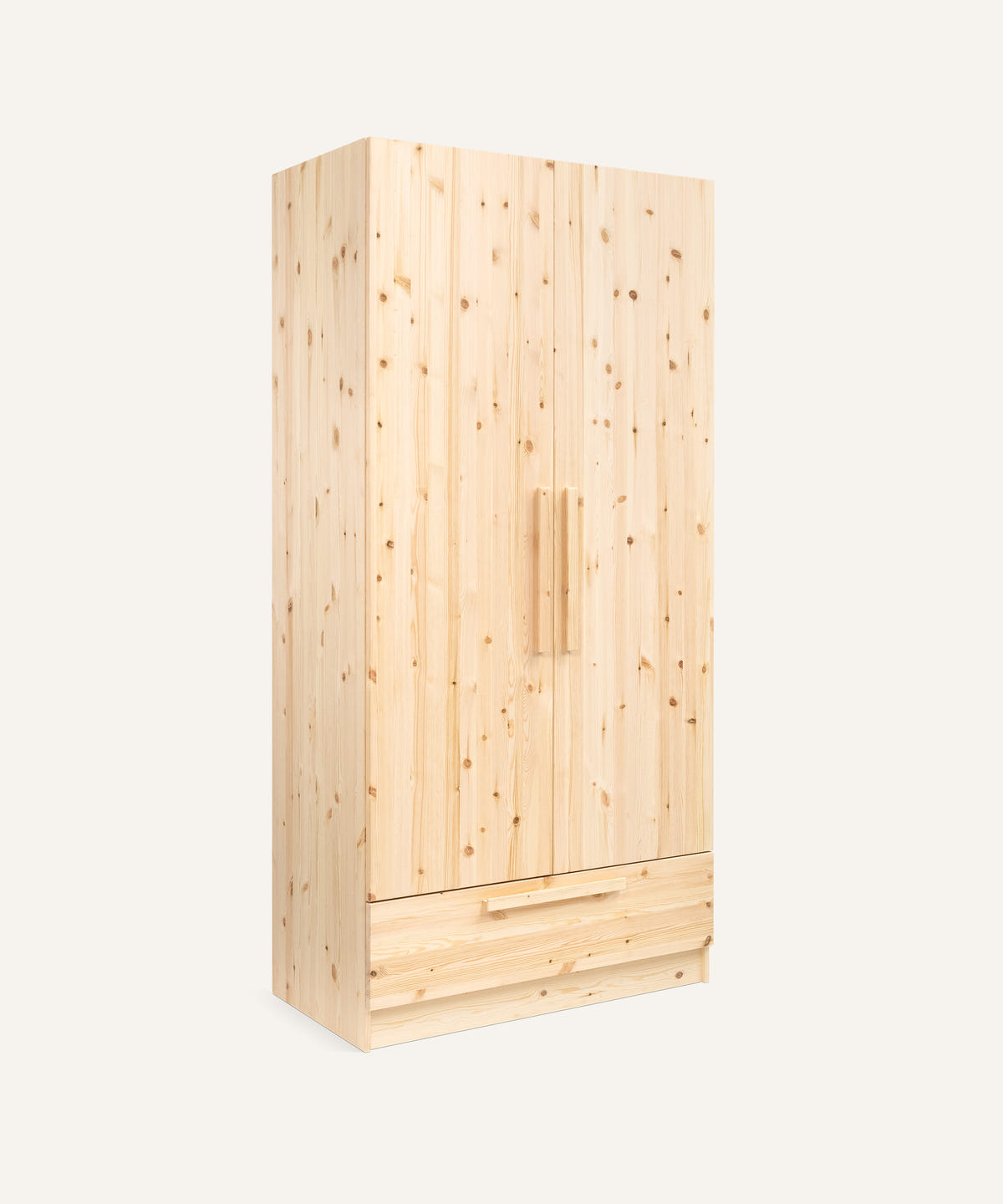 Der Schrank besteht aus FSC®-zertifizierter, naturbelassener Kiefer – ein Holz, das Wärme ausstrahlt, sanft duftet und durch seine lebendige Maserung jedes Stück einzigartig macht. Dank seines relativ geringen Gewichts bleibt der Schrank flexibel und begleitet Familien über viele Jahre hinweg – leicht, nachhaltig und beständig.
