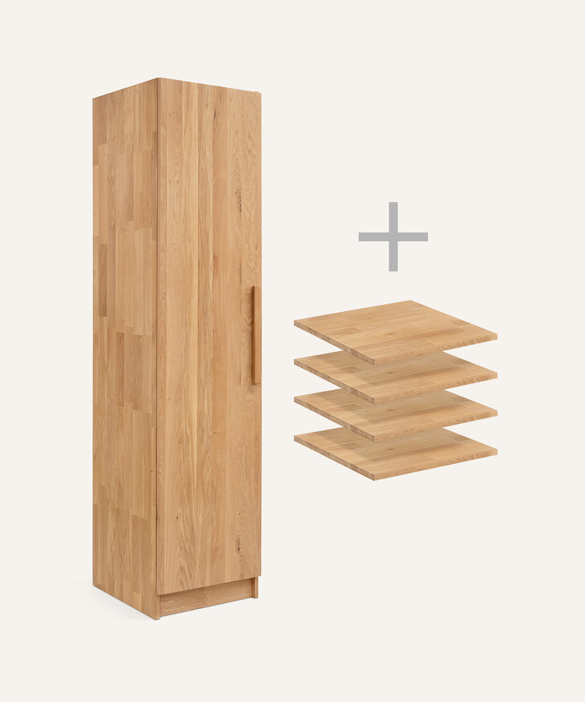 Der 50 cm breite Schrank aus massiver Eiche eignet sich ideal für kleinere Räume, Geschwisterzimmer oder überall dort, wo zusätzlicher Stauraum benötigt wird. Durch flexible Einlegeböden und eine Kleiderstange bietet er viele Möglichkeiten zur individuellen Organisation. Dank des cleveren Rastersystems lassen sich Einlegeböden und Kleiderstange beliebig versetzen – so passt sich die Innenaufteilung immer wieder neuen Bedürfnissen und Altersstufen an. Kinder erreichen ihre Sachen selbst, was Ordnung und Selbstständigkeit fördert.