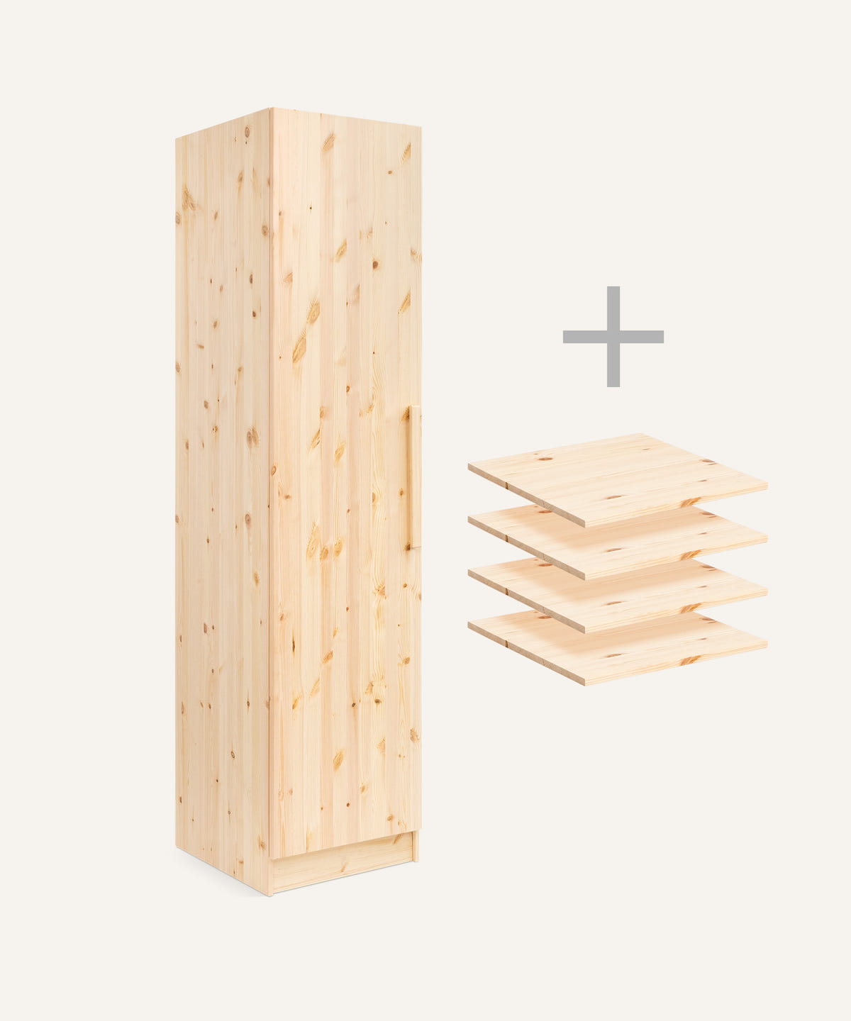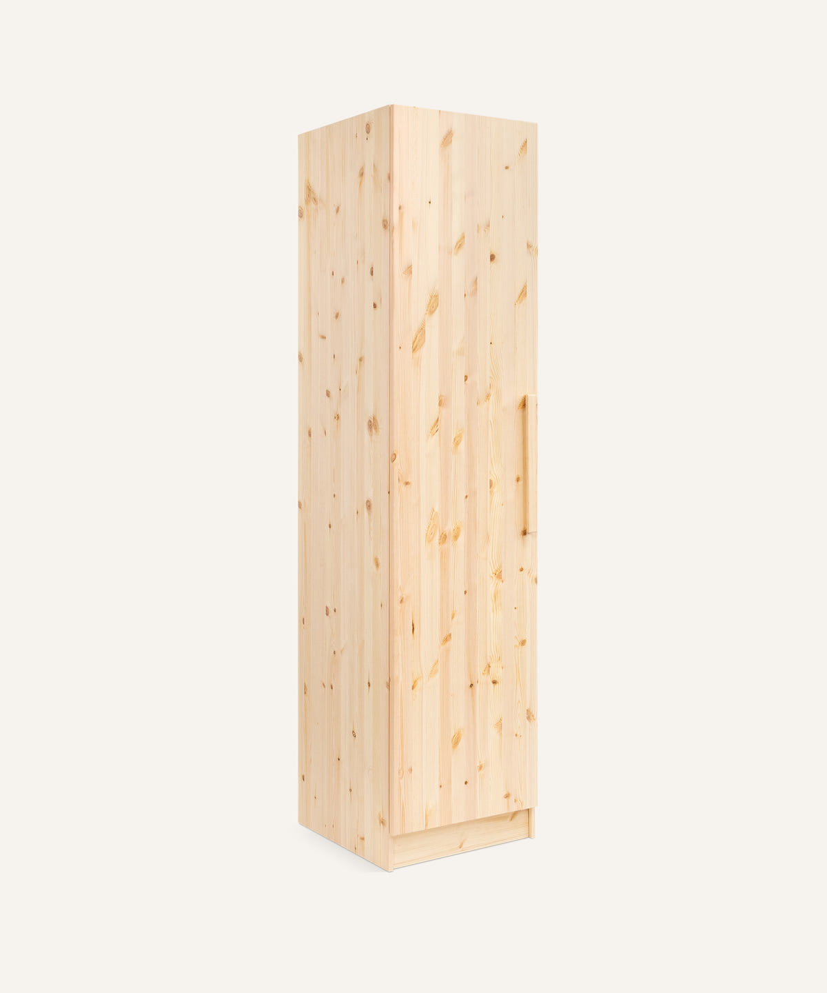 Der Schrank besteht aus FSC®-zertifizierter, naturbelassener Kiefer – ein Holz, das Wärme ausstrahlt, sanft duftet und durch seine lebendige Maserung jedes Stück einzigartig macht. Dank seines relativ geringen Gewichts bleibt der Schrank flexibel und begleitet Familien über viele Jahre hinweg – leicht, nachhaltig und beständig.
