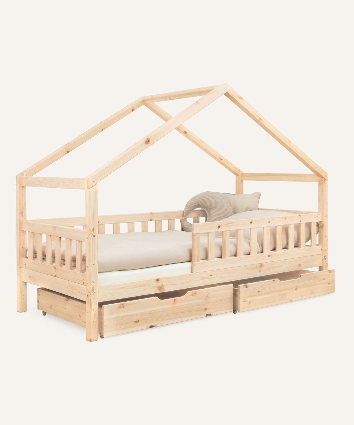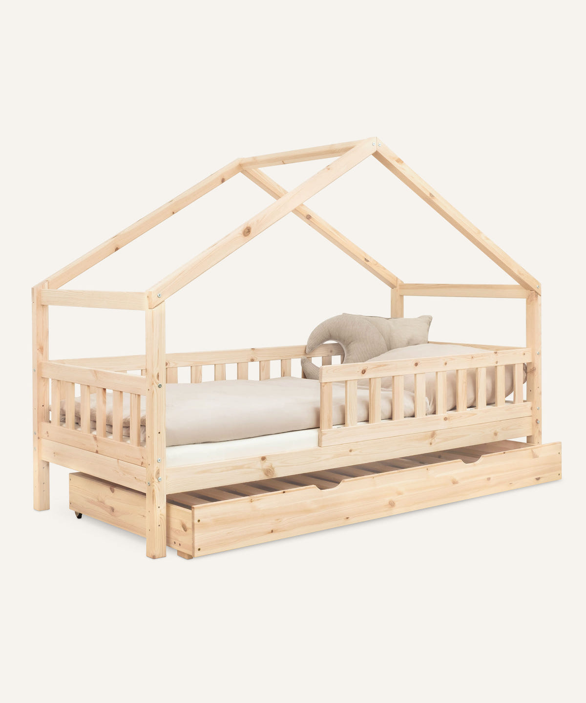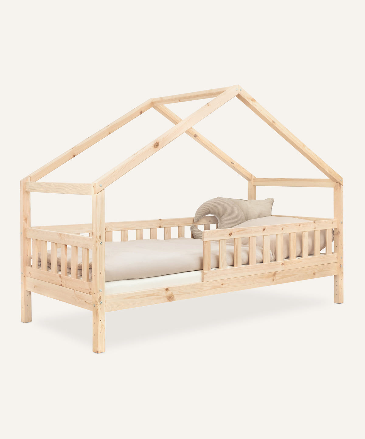 Ein Rückzugsort mit Weitblick: Das Panorama Hausbett überzeugt mit seinem längs verlaufenden Dachgiebel, der das klassische Hausbett neu interpretiert. Ob gemütlich schlafen, Bücher anschauen oder spielen – das Bett aus massivem Kiefernholz ist vielseitig einsetzbar und wächst mit den Bedürfnissen deines Kindes mit. Unser 2-in-1 Hausbett aus nachhaltigem Kiefernholz vereint Standardhöhe und bodennahes Hausbett in einem. Die niedrige Einstiegshöhe unterstützt, nach Montessori, die Selbstständigkeit im Alltag. Für kleine Kinder sorgt der beidseitig montierbare Rausfallschutz für ein sicheres Gefühl. Dank des charakteristischen Designs mit weitem Dachgiebel und durchdachten Extras wie Bettkasten oder Stauraumlösungen, wird das Panorama Hausbett zu einem langlebigen Begleiter im Kinderzimmer – von der Kita-Zeit (ab ca. 10 Monaten) bis weit darüber hinaus.